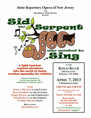 David directed the State Repertory Opera's production of the children's opera, Sid the Serpent who wanted to sing. With music direction by Warren Helms, the opera was performed on April 7th at the Kolo Club, 1422 Grand Street in Hoboken, New Jersey. The production is designed to tour and performable in both small and large venues.